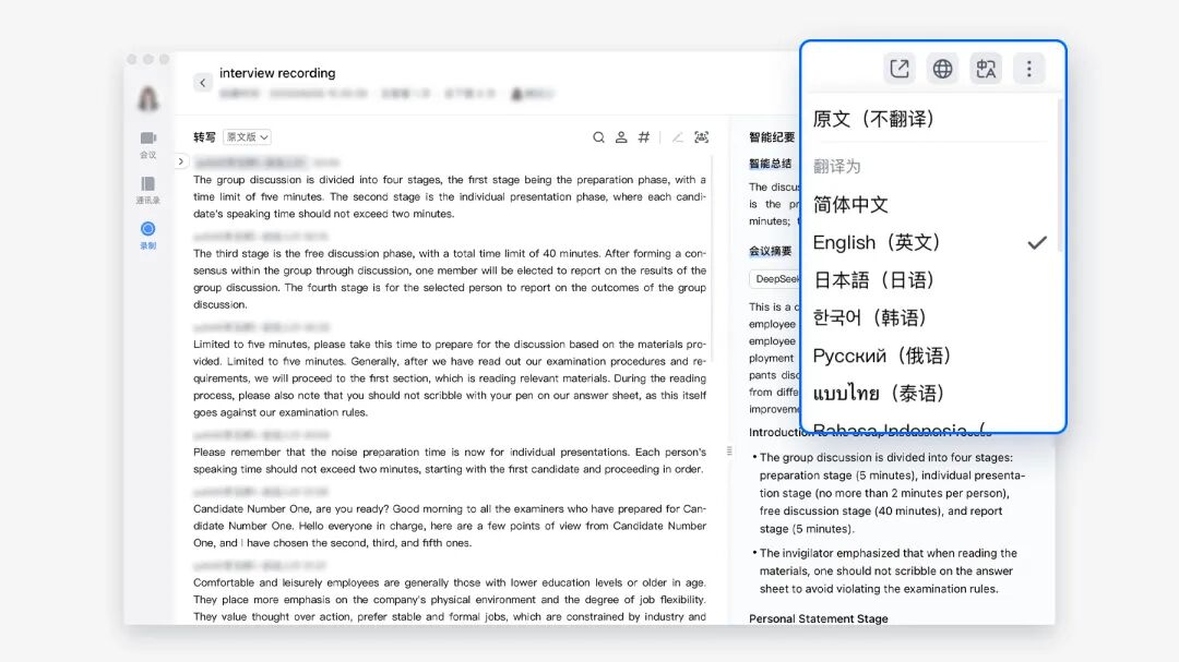 涉及跨国、跨地区协作时,使用传统录音设备,往往需要导出音频或文字,并再次输入给翻译软件,才能生成其他语言的文字转写,耗时耗力。