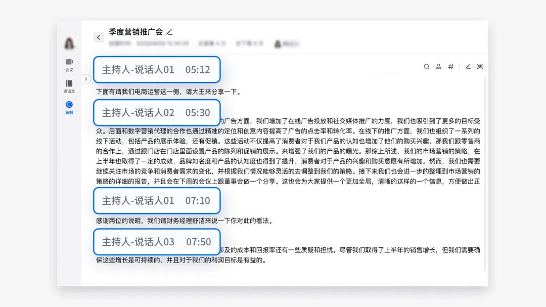 腾讯会议录音能精准区别不同说话人的声纹特征,在录音结束后,根据音色自动区分不同角色,将混杂的语音拆解为“说话人01”“说话人02”“说话人03”等带角色标签的独立文段,实现多说话人分离。即使多人共用一支手机麦克风来录音,也能清晰区分“谁在何时说了什么”。