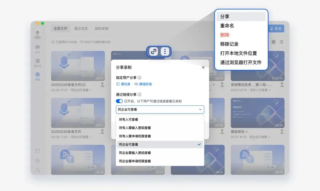 腾讯会议录音就是一个“既能管得住权限,又能存得下记录”的协作工具,录音文件支持加密链接分享,可设置查看、下载权限,重要敏感信息留存、流转都安心。