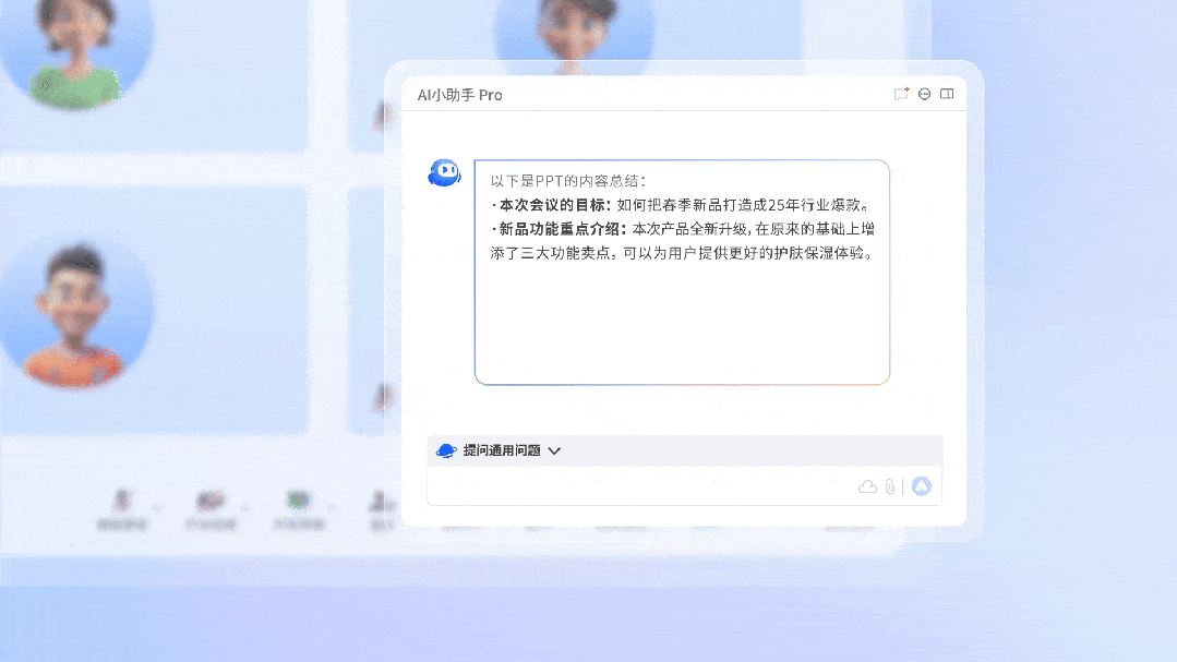 开工第一件事,就是设置好智能提醒,当有人提到“我”、关注的发言人或者话题时,AI小助手 Pro 就会自动发来提醒,还能继续提问,偶尔走神被CUE也不怕,它来帮你答!也能针对关心的话题,让它帮你搜索、解答。