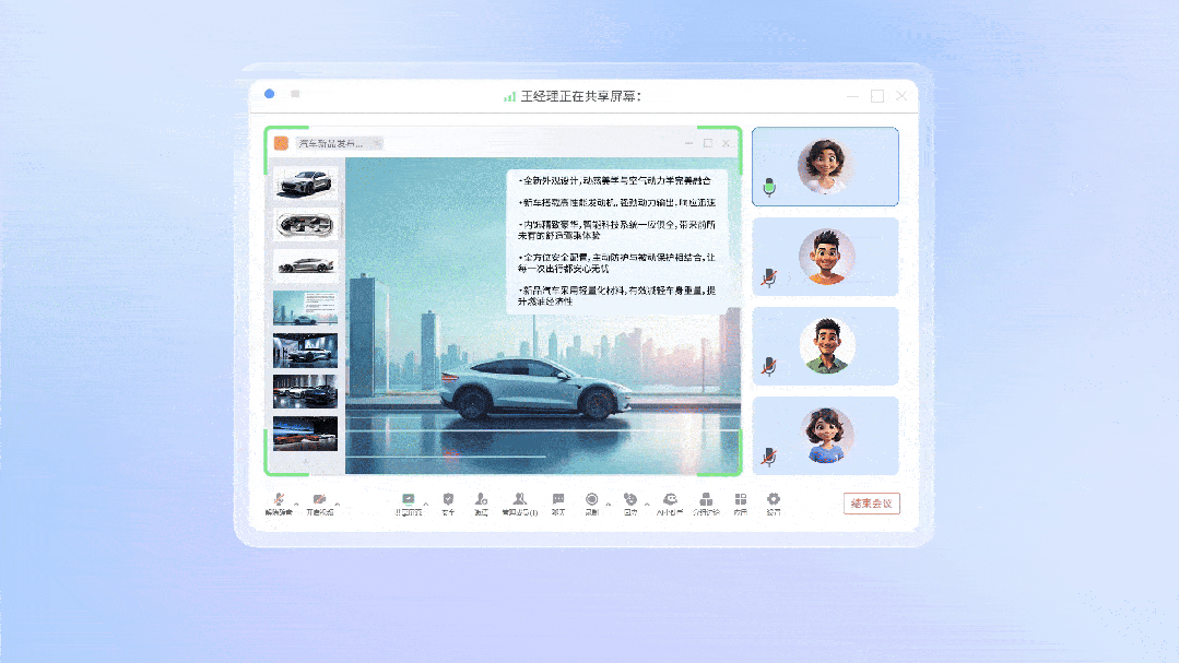 基于腾讯混元千亿参数大模型的强大分析思考能力,支持实时获取互联网上的海量信息,还可以在会议前中后的任何时刻生成内容大纲、及时补充创意,为团队注入智慧,帮你恢复元气,秒变开工领头羊!