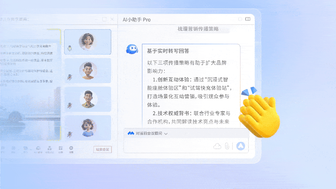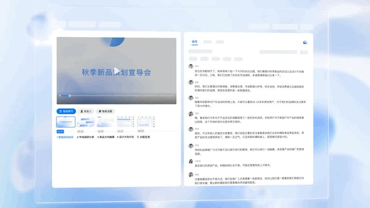 打开之前的会议录制,不用自己从头到尾浏览,不懂的就向 AI小助手 Pro 提问,它将会依托本场会议的录制和转写,为您找到想要的细节和重点。结合智能纪要、智能话题、发言人等功能,让开工更思路清晰,做项目里最远见的鹰!