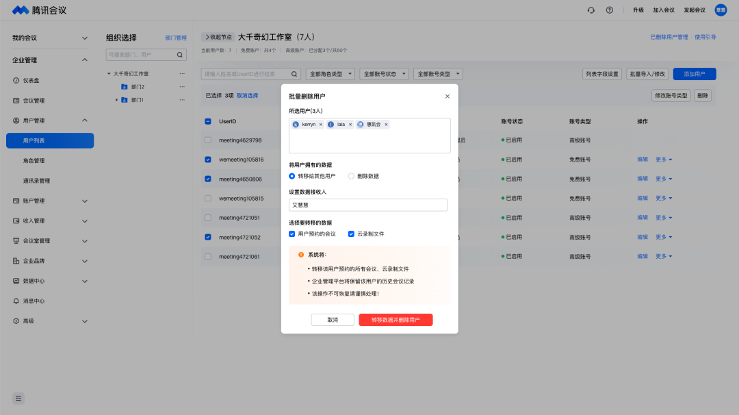 值得注意的是,企业分配给员工的高级账号,归属为企业组织所有,员工离职带不走,可再次重新分配给其他企业成员,资源不浪费,会议资源有效利用。这样可以避免员工自己购买高级账号、离职带走会议录制而意外泄密的噩梦!