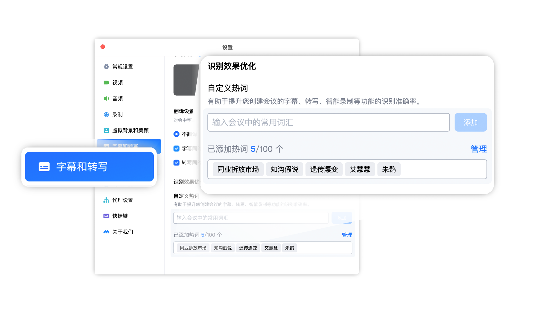现在,您可以打开客户端设置,添加会议常用的语音识别热词。当您在使用字幕、转写或云录制功能时,腾讯会议将优先识别您所设置的热词,有效提升会议中语音转文字的准确率,提升您和与会者的参会体验。