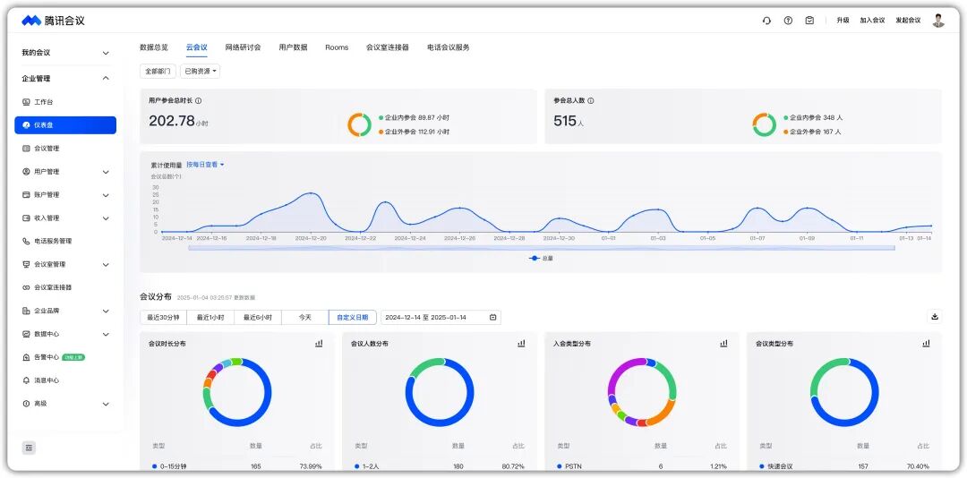 在商业版、企业版的企业管理后台,仪表盘将企业所有的会议资源的使用情况进行统计分析,并以图表的形式呈现,实现会议数据可视化,轻松管理会议资源,高效运营。
