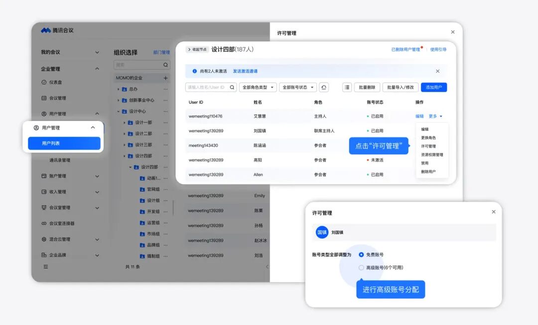 ○ 统一采购管理:创建组织后,企业可统一购买多个高级账号,并统一分配给企业成员。让每位成员随时都能自行发起会议,进行业务交流沟通。既省去单独报销流程,也方便管理员随时分配资源,避免浪费。