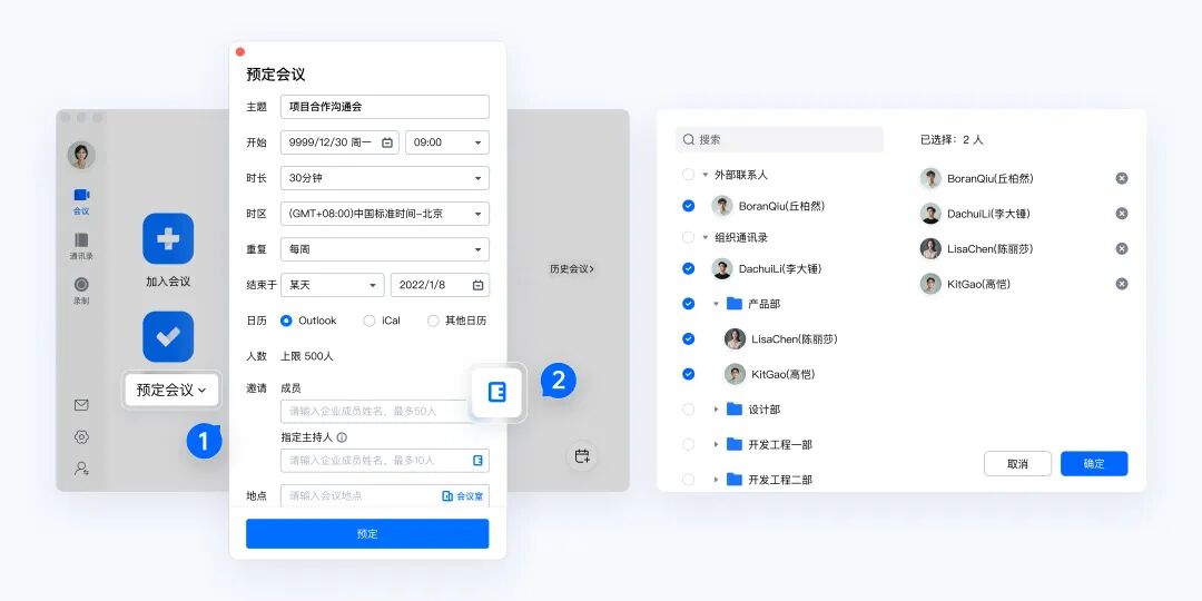 ○ 精准组织和通知:通过组织通讯录预定会议时,直接选择部门或成员,会议时间如有变动,自动同步到每位参会者的日程表,确保不错过每一场关键会议。