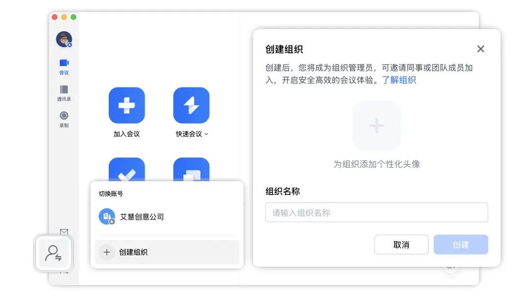 进入腾讯会议APP,点击左下角【切换账号】-【创建组织】,设置名称和个性化头像后即可完成创建。通过链接或二维码邀请团队成员加入,让组织管理从开工第一天顺畅运行。