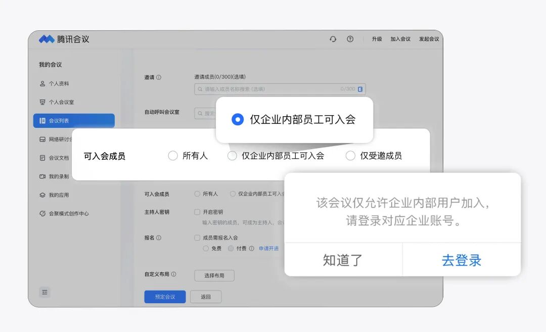 ○ 入会限制:组织企业内部会议,可设置“仅企业内部成员可入会”,即使遇到仿冒企业员工姓名与头像的外部人员,将直接被拦截在外。您也可选择预定特邀会议,仅受邀成员才能可入会,邀请链接转发也无效。