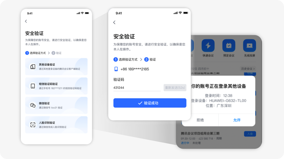 ○ 安全登陆与验证:若企业员工账号在新设备上使用,腾讯会议支持要求进行二次核验,企业员工可通过手机验证码或旧设备授权两种方式进行验证,避免被盗号登录的风险。