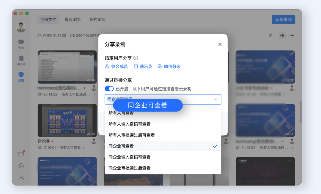 ○ 录制安全共享:云录制和转写链接支持设置“同企业可查看”,保障内部分享安全高效。