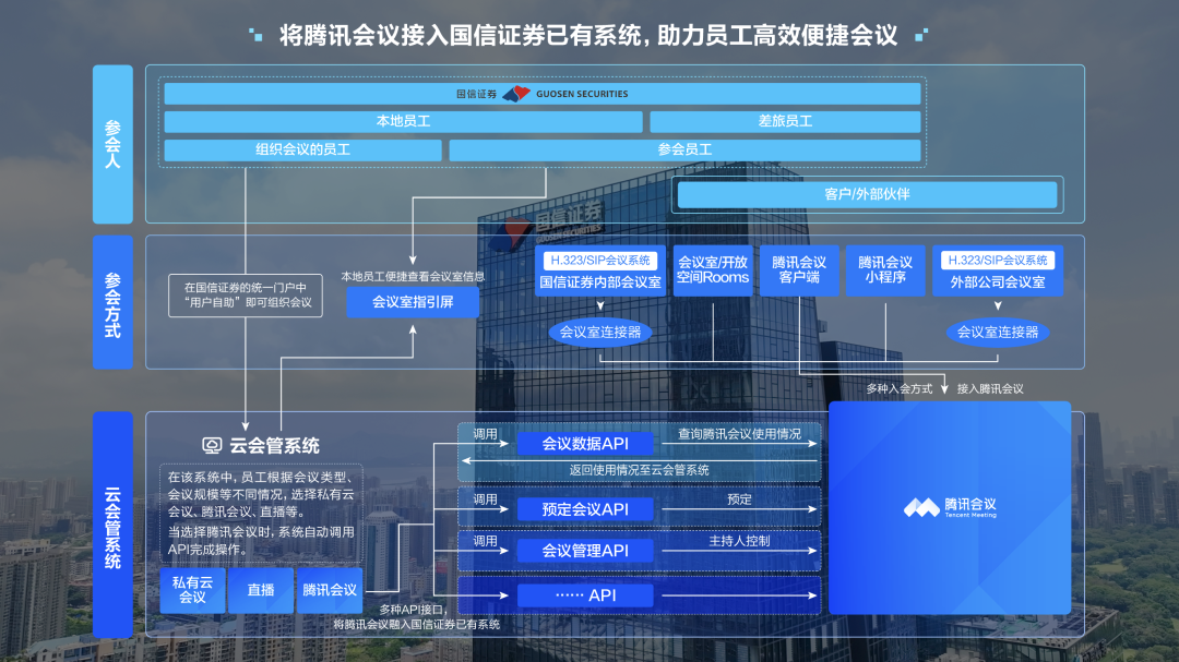 随着业务的发展,内部专网会议无法满足跨地域跨公司的交流,国信证券选择了腾讯会议。但面对已搭建的会议系统,国信证券又是如何以更低的部署与开发的成本将腾讯会议企业版对接进自有门户,助力117个城市的员工高效沟通协作的呢?