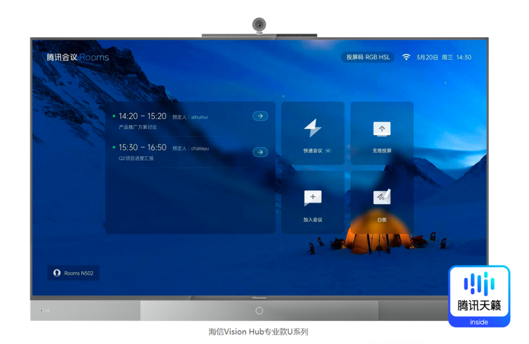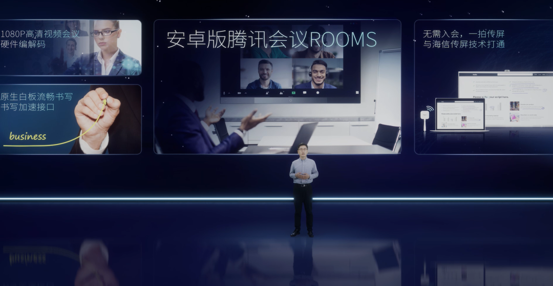本次,海信与腾讯会议团队联合开发,完成了海信智慧平板与安卓版腾讯会议Rooms的深度融合:实现了1080P高清视频会议,用户开机即享一键入会,可便捷连接腾讯会议PC端、移动端、小程序等多端与会人。