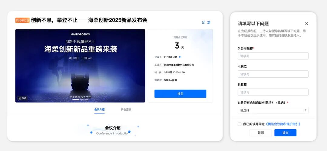 在发布会前,海柔创新依托腾讯会议Webinar的品牌化报名管理能力,将报名二维码统一嵌入多渠道宣传页面,用户可扫码直达定制化报名页。
