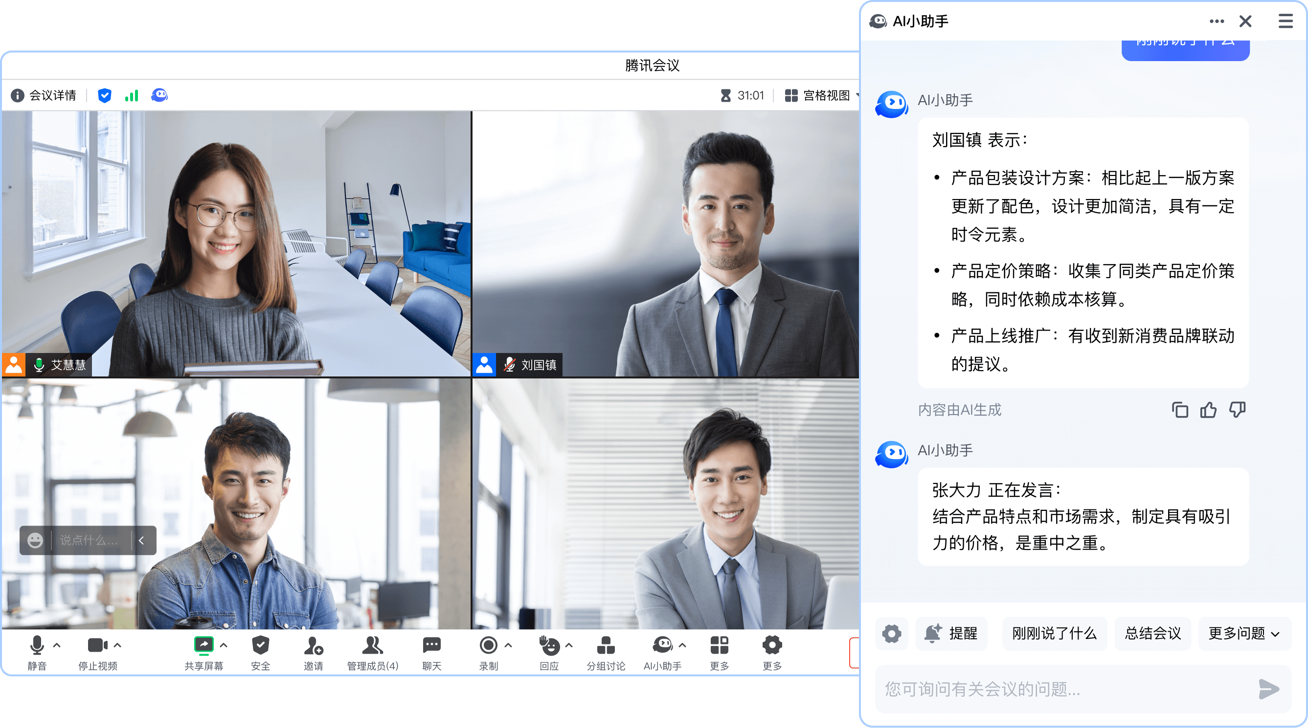 AI小助手能够实时解答您关心的各种问题,让您轻松应对复杂庞大的会议信息量,提升开会效率: