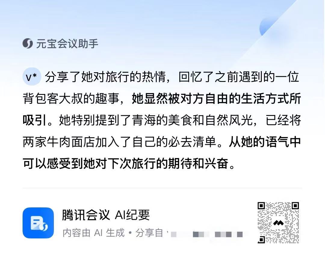 会议君发现有越来越多的朋友用腾讯会议连麦聊天、一起看剧或是游戏连麦开黑。现在只需一键生图分享,那些爆笑对话或高光时刻就会变成精美的卡片,附带AI的情绪洞察,成为珍贵的记忆,快来试试!
