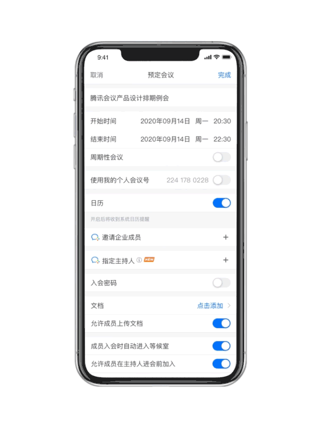 在预定会议时,企业用户可以直接添加参会者或指定主持人,会议邀请自动同步到参会者会议列表,并通过腾讯会议客户端、公众号实时发送参会提醒,组织者轻松实现一呼百应,让所有人“准时参会”从此不再成为难事。