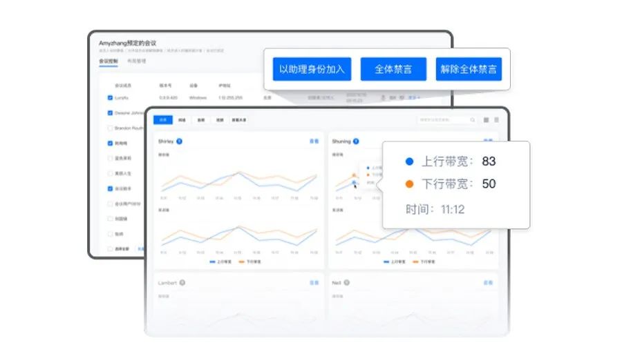 管理员还能在场外实时跟踪与会人连线质量,发现发现丢包、时延出现异常时,及时调整接入状态,同时不干扰与会人的讨论,在兼顾会议私密性的同时,全程无压力护航企业会议,保障稳定、有序进行。