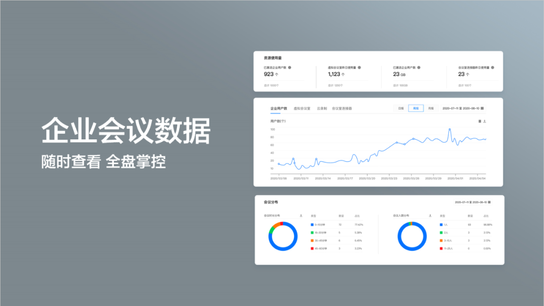 腾讯会议企业版提供可视化超级控制台,让企业管理员对企业的会议数、时长等情况,实时了解,全盘掌握,更好地透视企业会议管理效率,给出企业信息化升级提效建议。