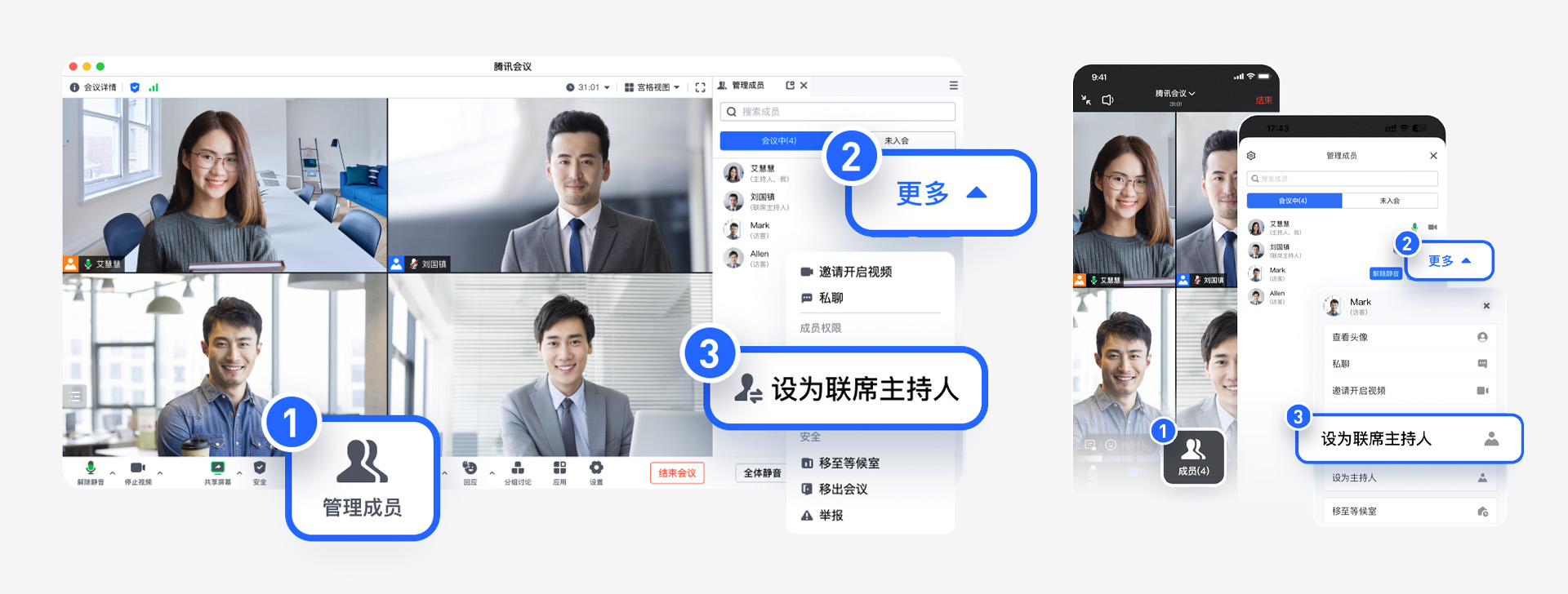 面对大型会议、线上培训或研讨会,主持人的精力是有限的,专业版可设置最高4位联席主持人。