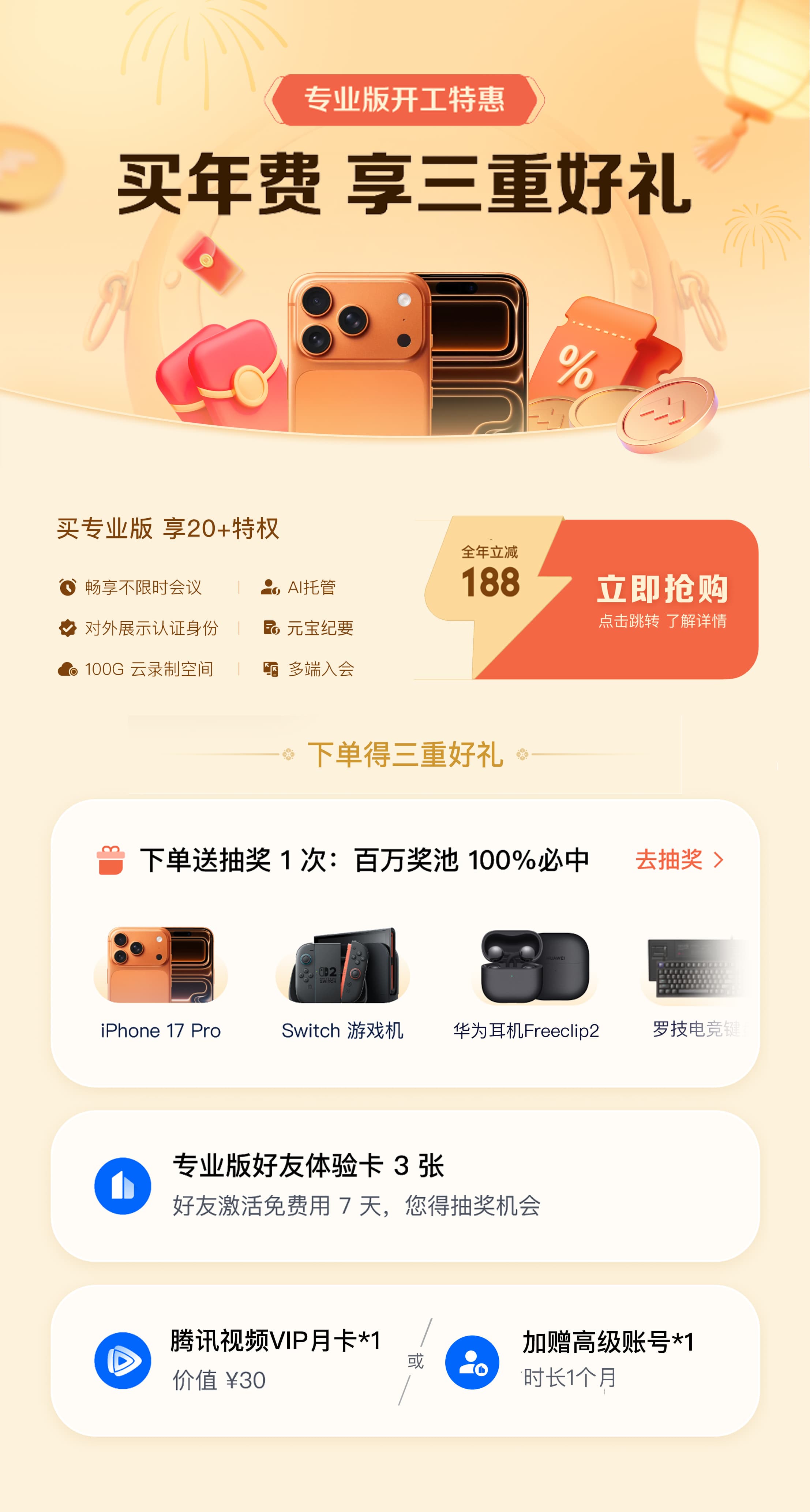 买腾讯会议专业版年费,享三重好礼;新客赠“开工红包”,开通连续包月首月立减30元!现在下单立即参与抽奖,100%必中,iPhone 17 Pro、Switch 2、华为Freeclip耳机、罗技电竞键盘等你拿!