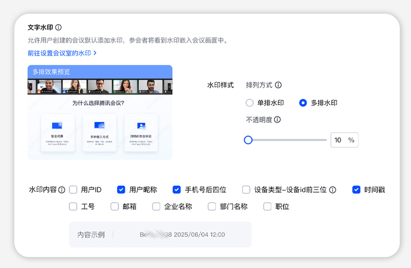 担心会议内容外泄?专业版可开启文字水印和音频水印实现双重防护,为您的会议信息筑牢安全防线。