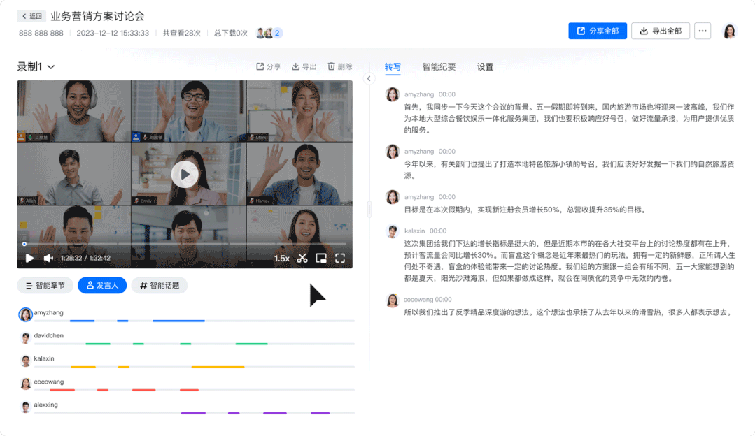 「智能话题」:自动提炼出会议中的核心关键词,点击哪个词,就直接定位到所有相关讨论片段。