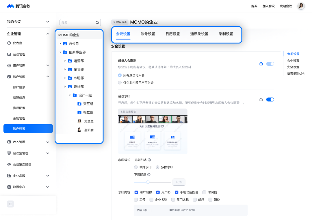 员工的企业版账号归属企业所有,超级管理员最关心的就是员工用得顺心、会议安全得到保障。