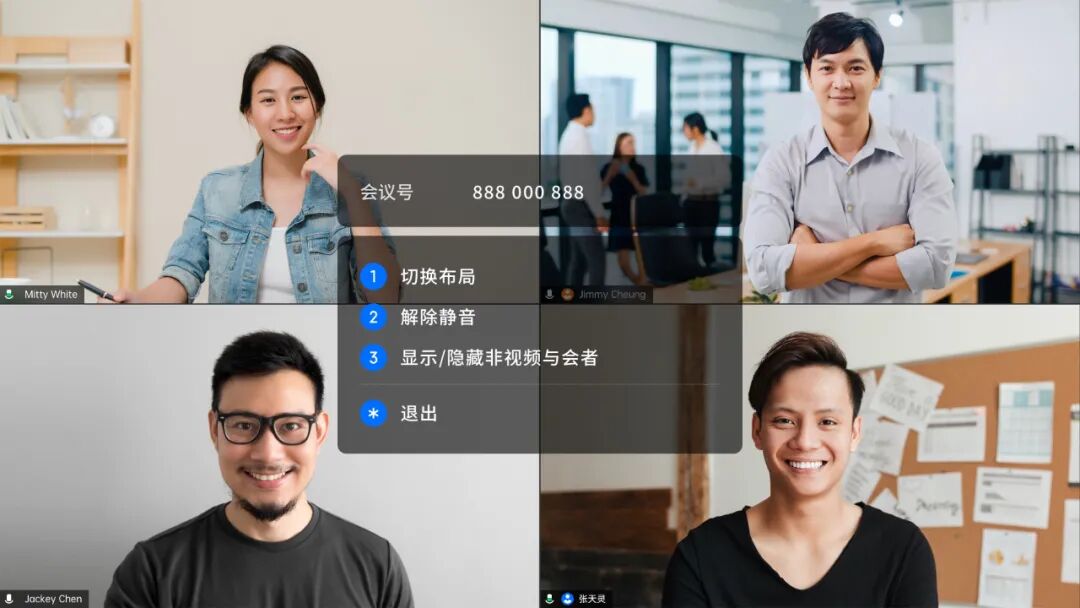 通过会议室连接器2.0接入腾讯会议后,视频终端在本地展示时,通过短按遥控器数字3键可选择显示/隐藏非视频与会者,帮助与会者聚焦会议重点。