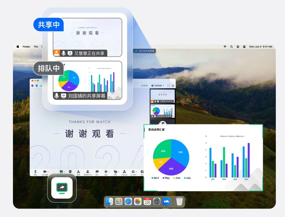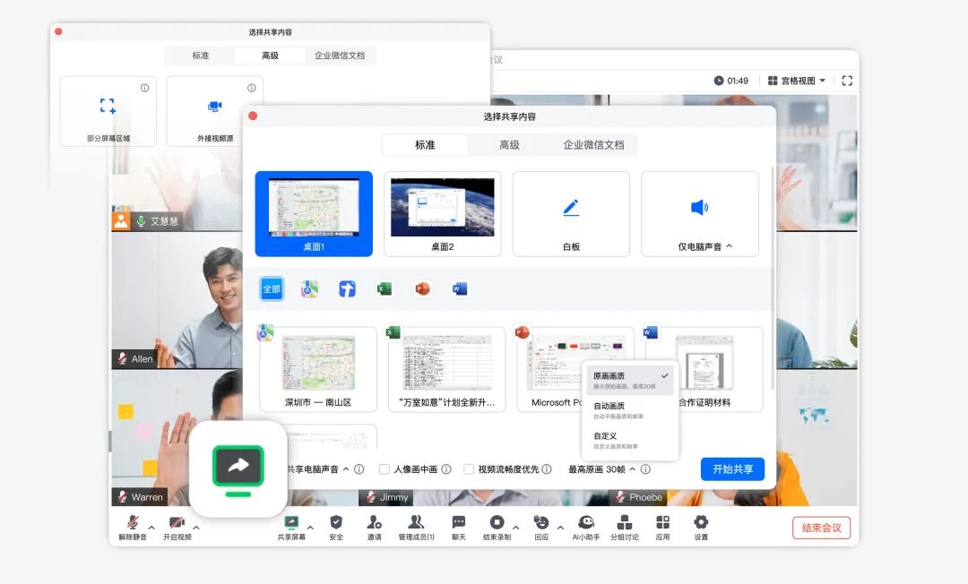 在工位上开会,当您要分享各类材料时,别忘记用上这两个小妙招!搭配使用「人像画中画」和「多端入会」,让共享屏幕的每时每刻都生动!