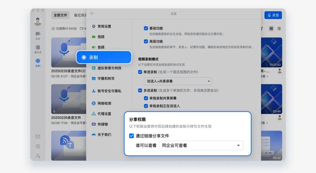 一键预设分享范围,告别重复操作。在会议结束后,无需每次手动勾选权限,让会议内容流转更高效、更安全!