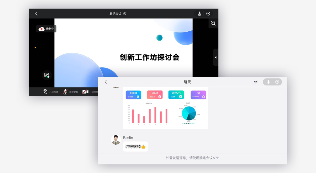现在,通过小程序入会的用户可实时查看会议聊天内容,信息同步零延迟、不遗漏,无论是关键决策要点、共享文档链接,还是文字整理的要点,均与APP保持同步,助你全程紧跟会议节奏。