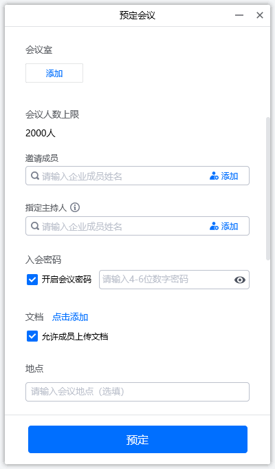 如果不希望其他人进入,可设置【会议密码】、开启【等候室】,或选择预定“特邀会议”。