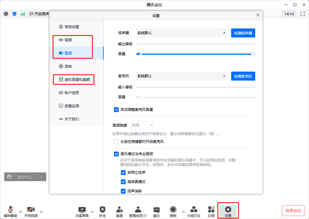 音视频设置:其次,事先开启一个会议调试视频和音频。设置虚拟背景,不用担心所在环境杂乱的问题;一点点美颜,让自信心更充足;带上耳机,让收声更清晰。