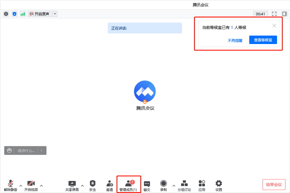 开启等候室后,每当有成员入会时,会议都会通过提醒有人在等候。主持人可点击【查看等候室】,查看正在等候中的成员。