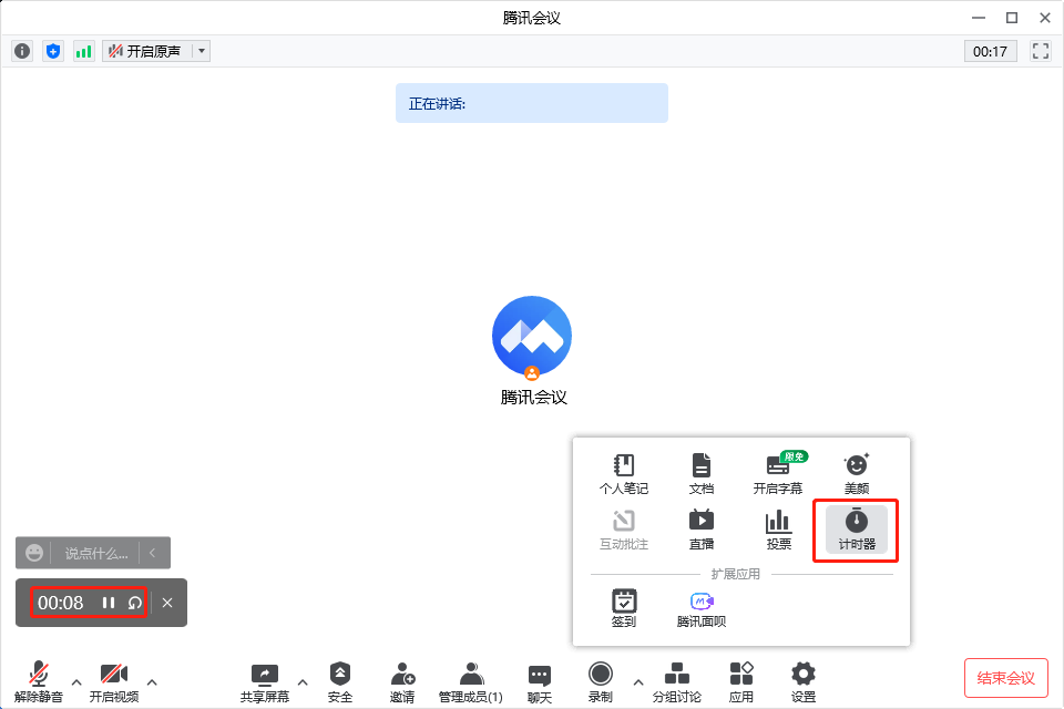 桌面端点击【应用】-【计时器】,即可开启计时,帮助管理答辩时间。