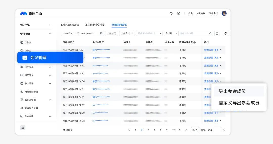 在员工个人中心的会议列表中,可以导出会中成员的名单、参会时长、入会次数和签到记录等信息,有效减少了手动统计和记录的时间。