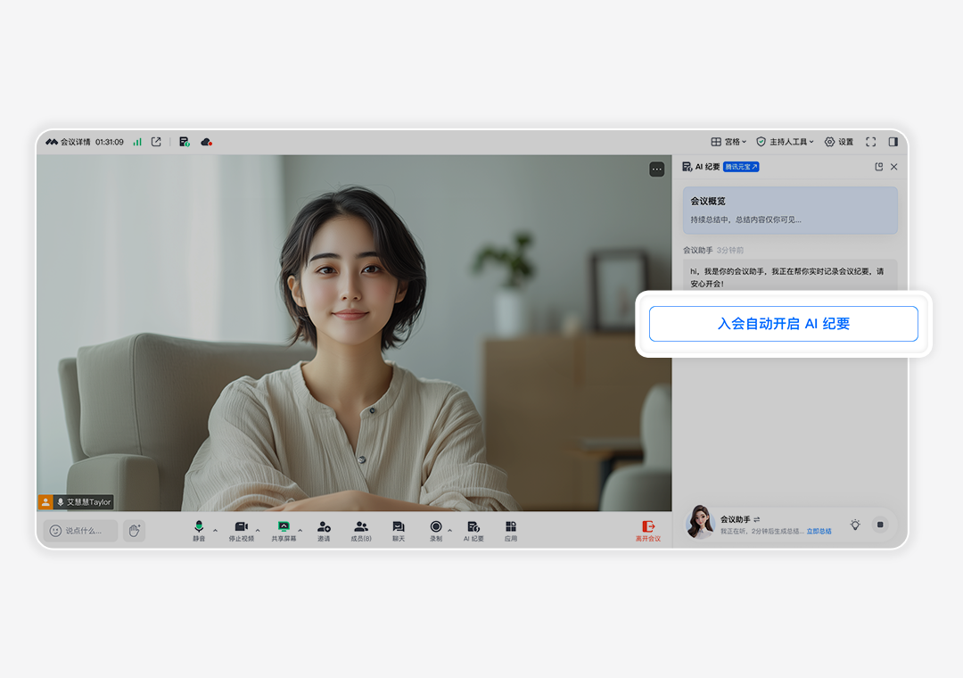 除此之外,会中在AI纪要的页面里也将出现设置按钮,点击即可一键开启。设置一次,一劳永逸,从此每个会议都自带会议秘书!