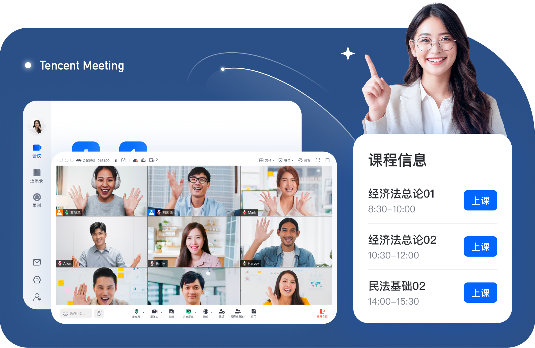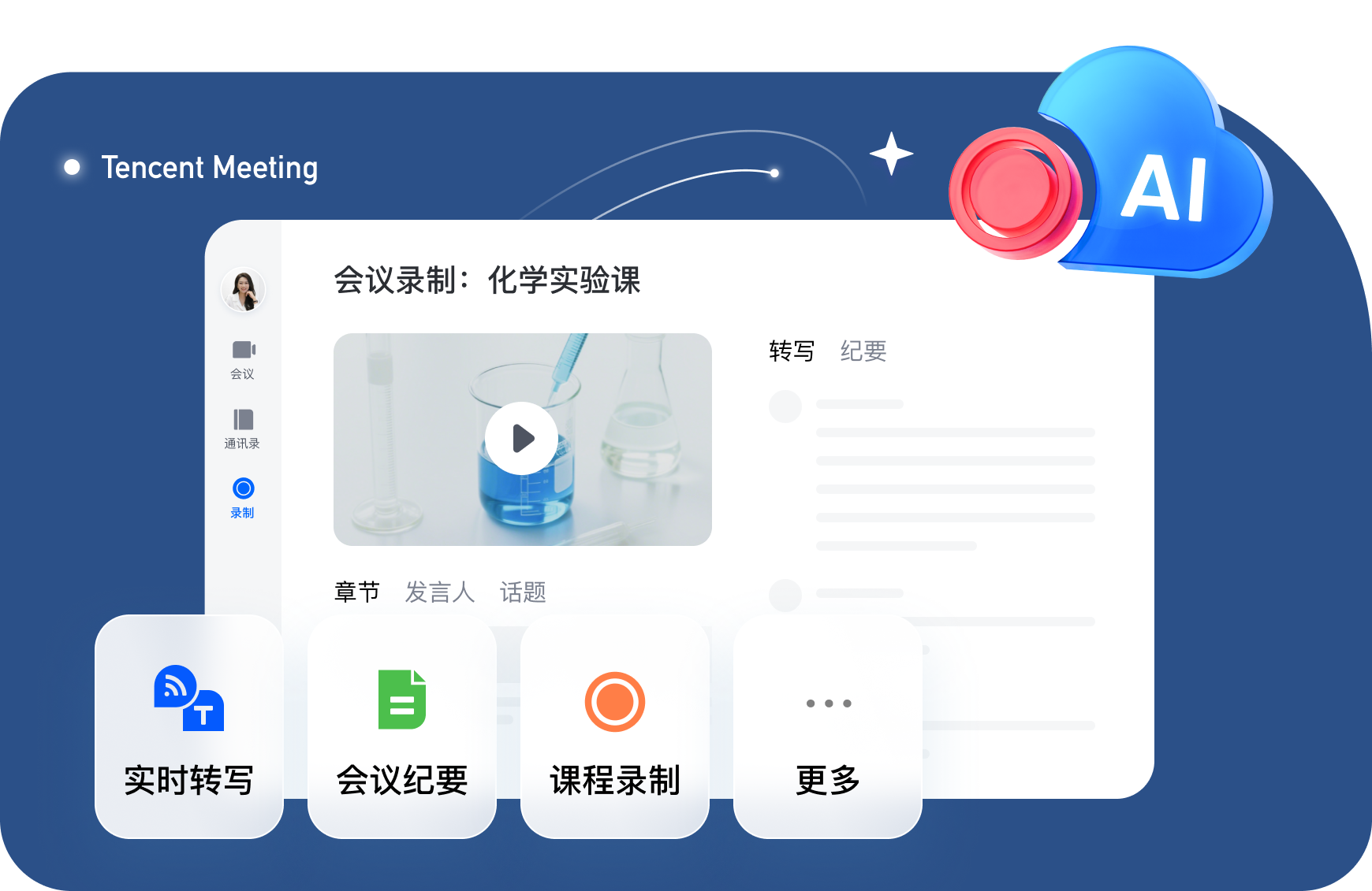 上课时会议统一开启录制,课堂结束直接生成本次课程录制并且发送给学生系列课程。AI字幕、实时转写、智能纪要等能力帮助学生轻松回顾课堂内容。