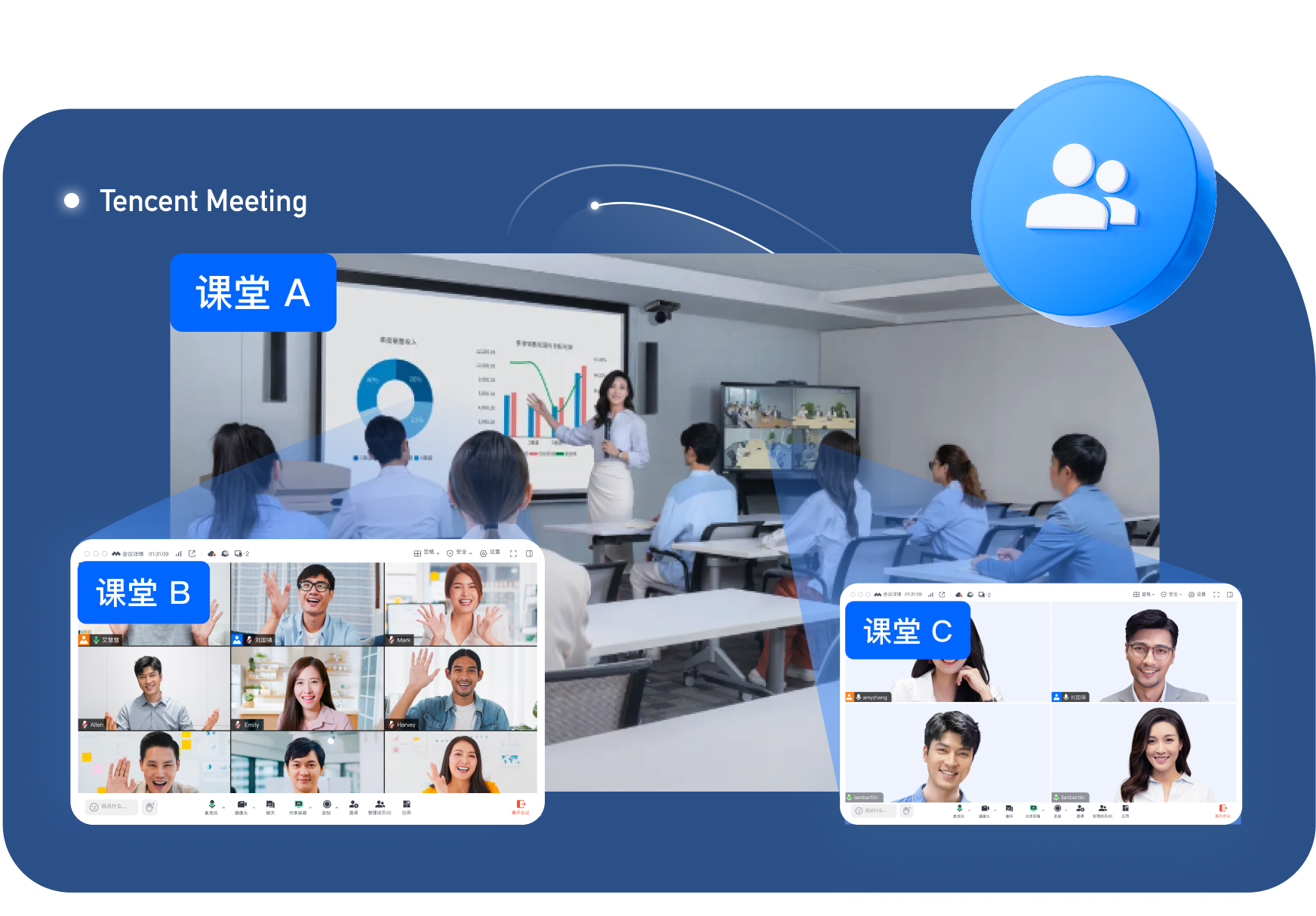 多个线下课堂同时加入会议,可以一起互动协作,打破空间限制,响应国家政策。