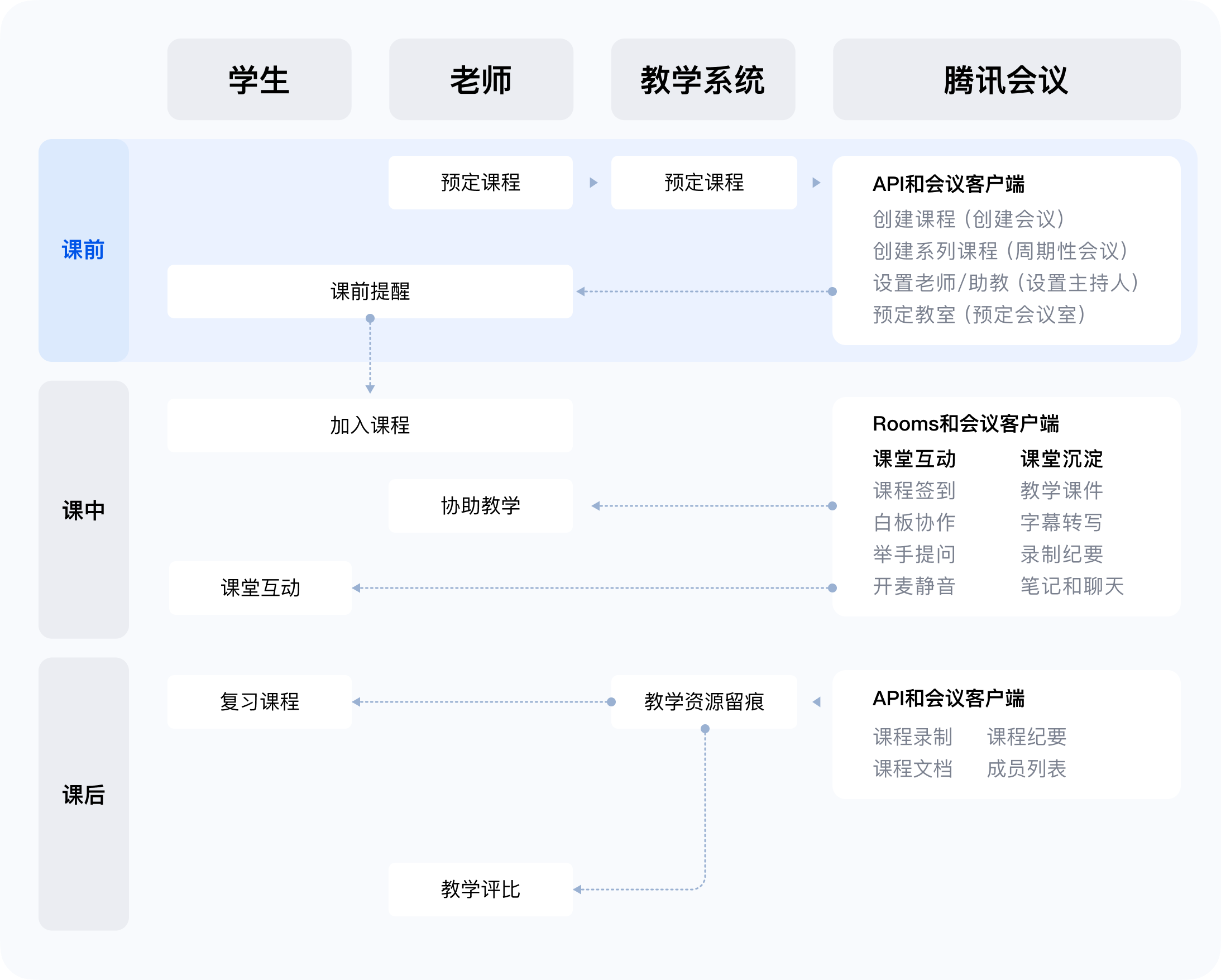 通过接口批量预定课程并加入老师与学生,老师与学生可在客户端上同步查看课程信息,接收课前提醒与一键开课。