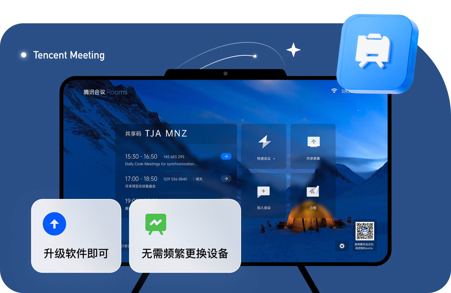 腾讯会议和会议室 (Rooms) 扩展性强,学校只需要简单升级软件,无需频繁更换设备。