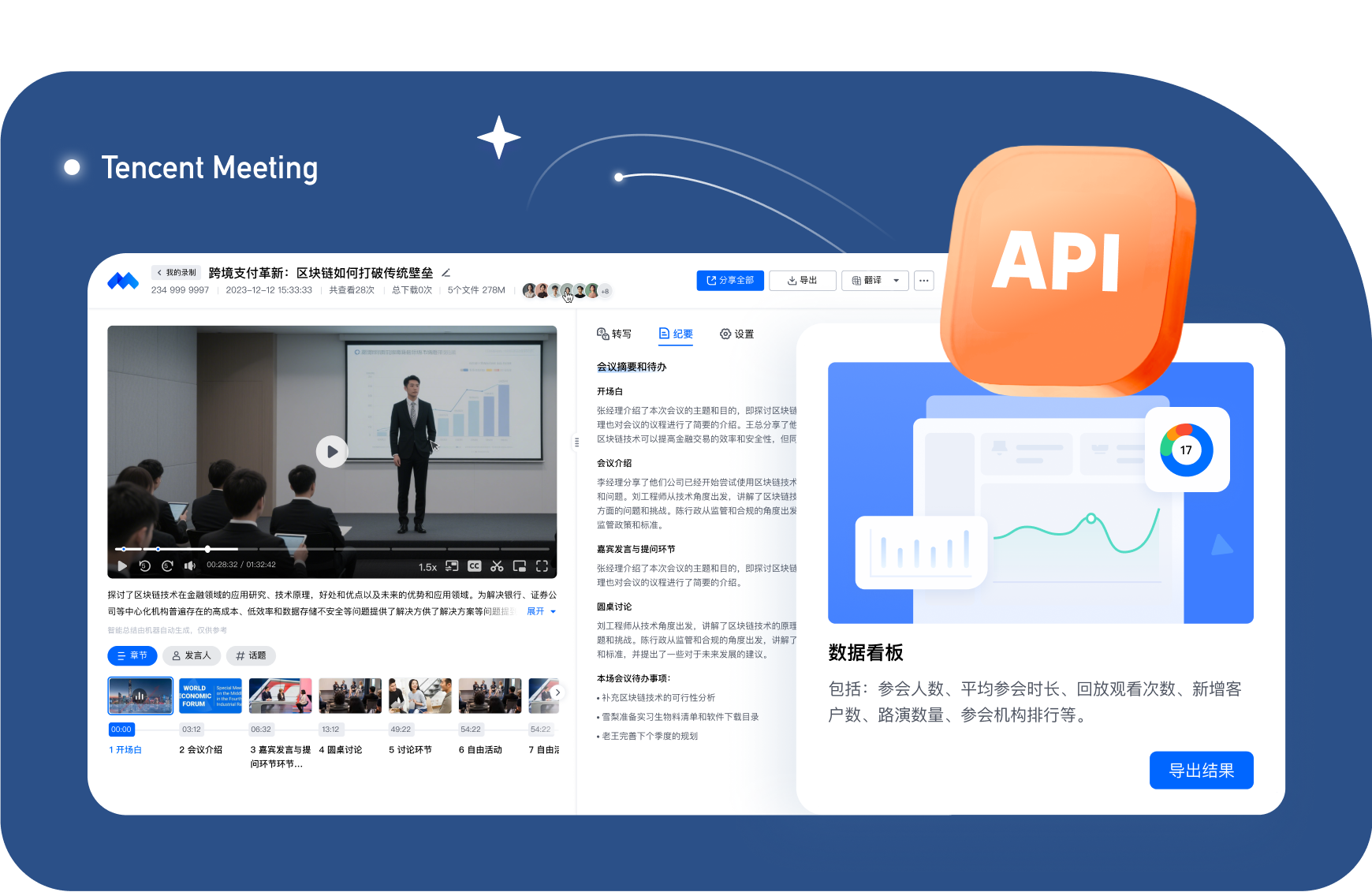 通过API直接导出数据到应用/客户系统自动进行数据统计或者数据归档。一键获取完整路演云录制和文档等内容。
