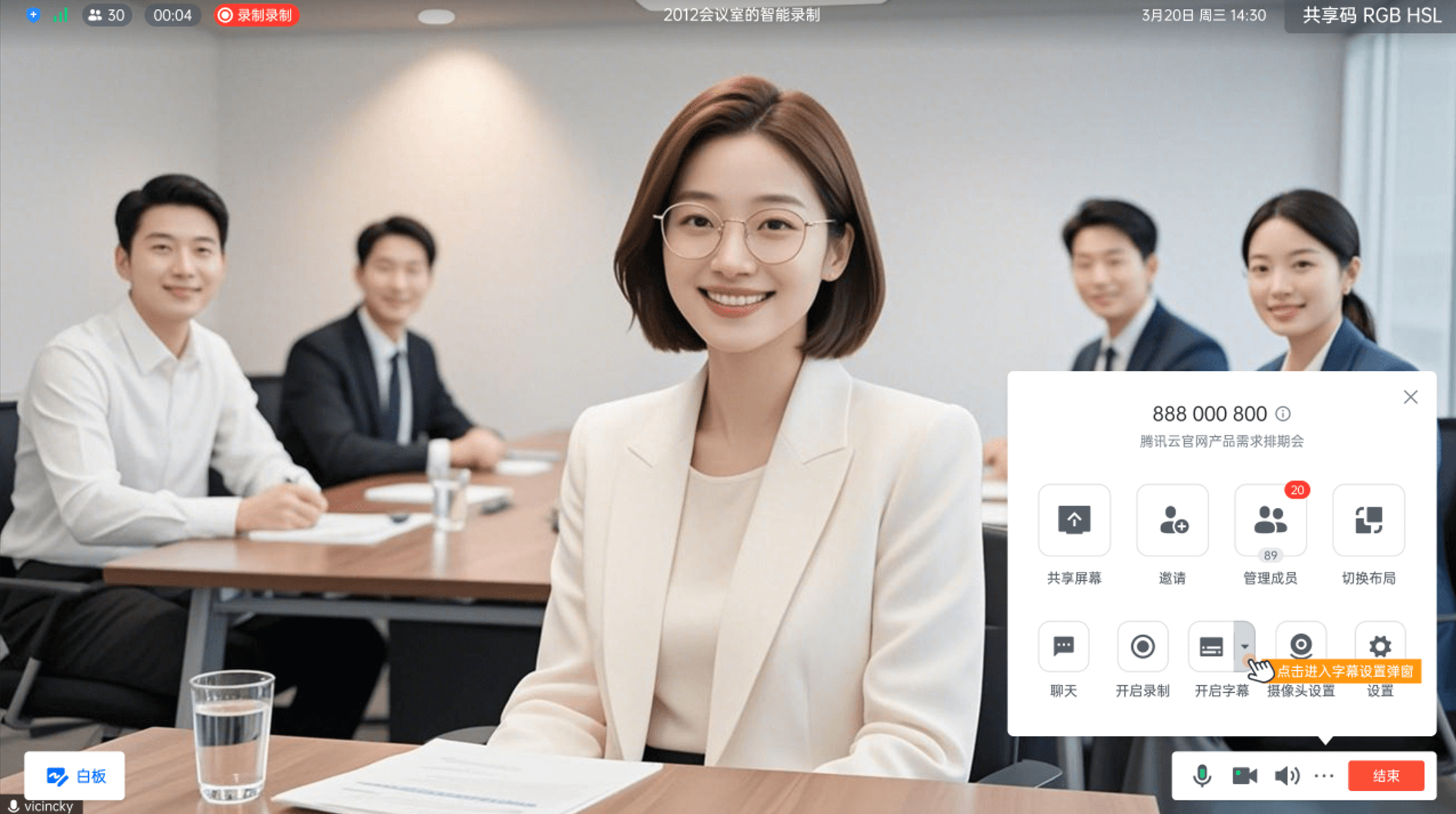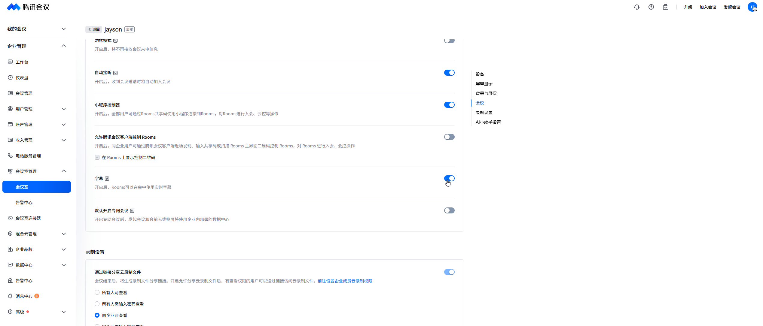 1.在腾讯会议官网>企业管理>会议室管理>会议室>会议室设置页签中,可以开启/关闭字幕设置。