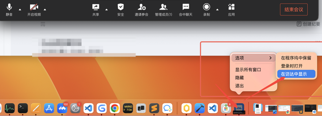 第一步:企微发起一个快速会议,然后选择【企业微信-会议】进程,右键选择【在访达中显示】。