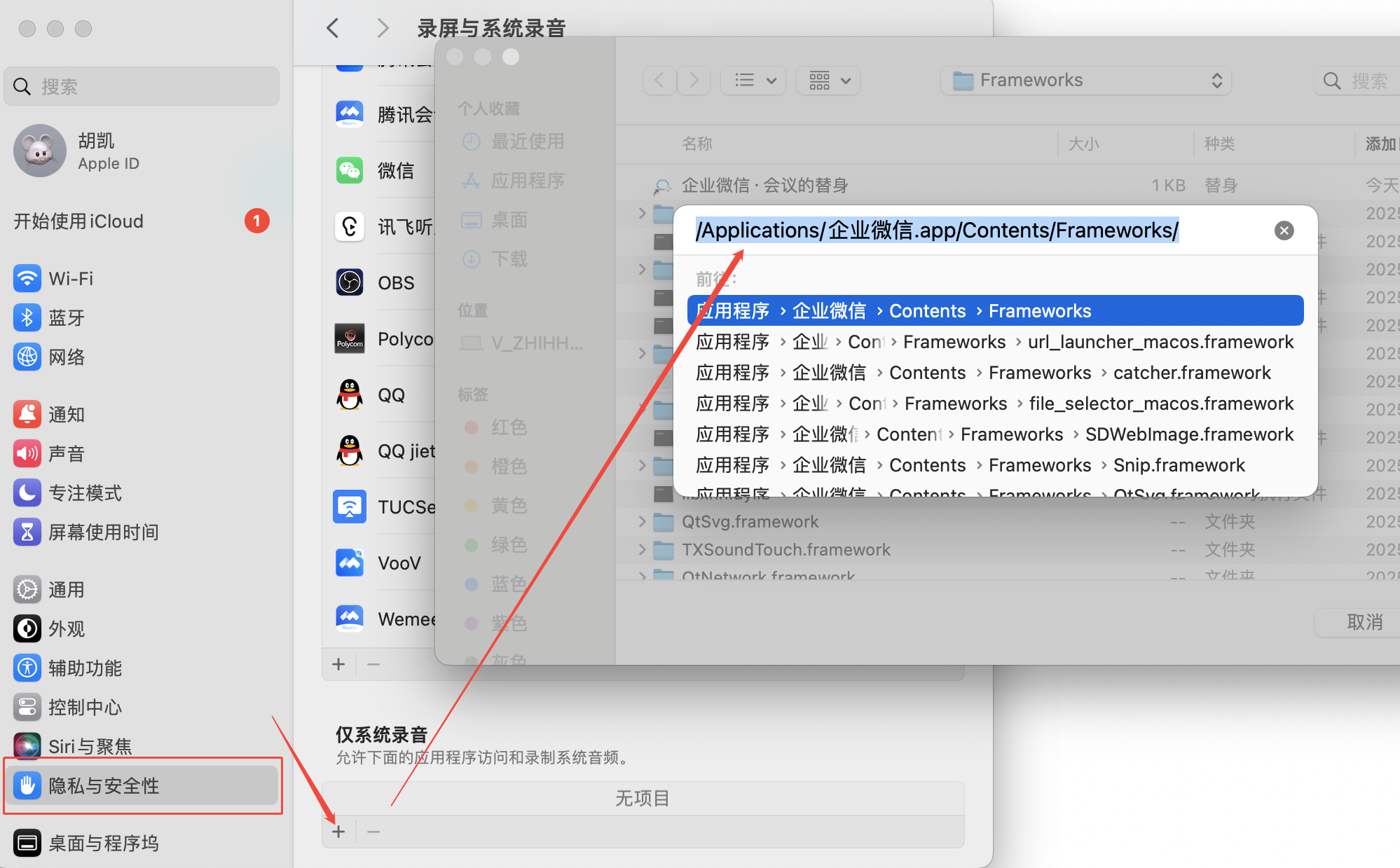 第三步:打开隐私与安全性,选择“+”添加,在弹出的文件选择窗口用快捷键Command+Shift+G找到app。