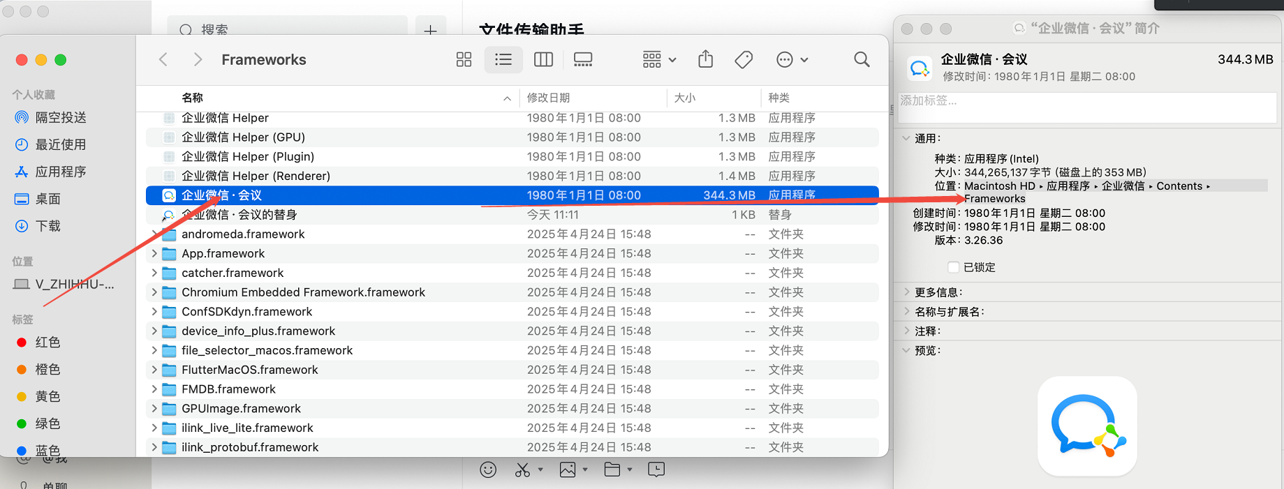 第二步:右键【企业微信-会议】,选择【显示简介】,弹出界面复制位置路径;/Applications/企业微信.app/Contents/Frameworks。