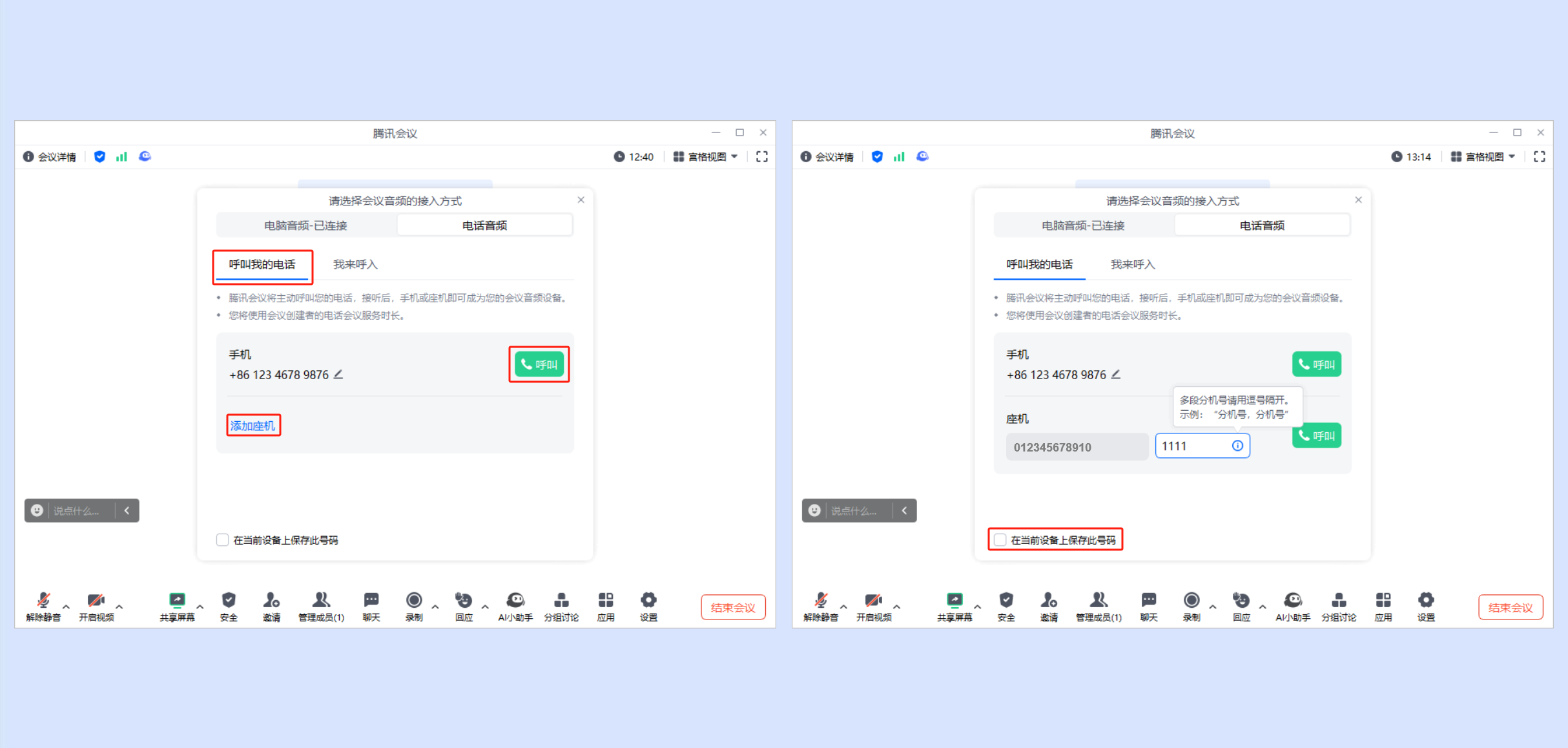 如果您使用桌面端参会,也可以使用电话音频,座机或手机将作为本场会议的麦克风和扬声器。