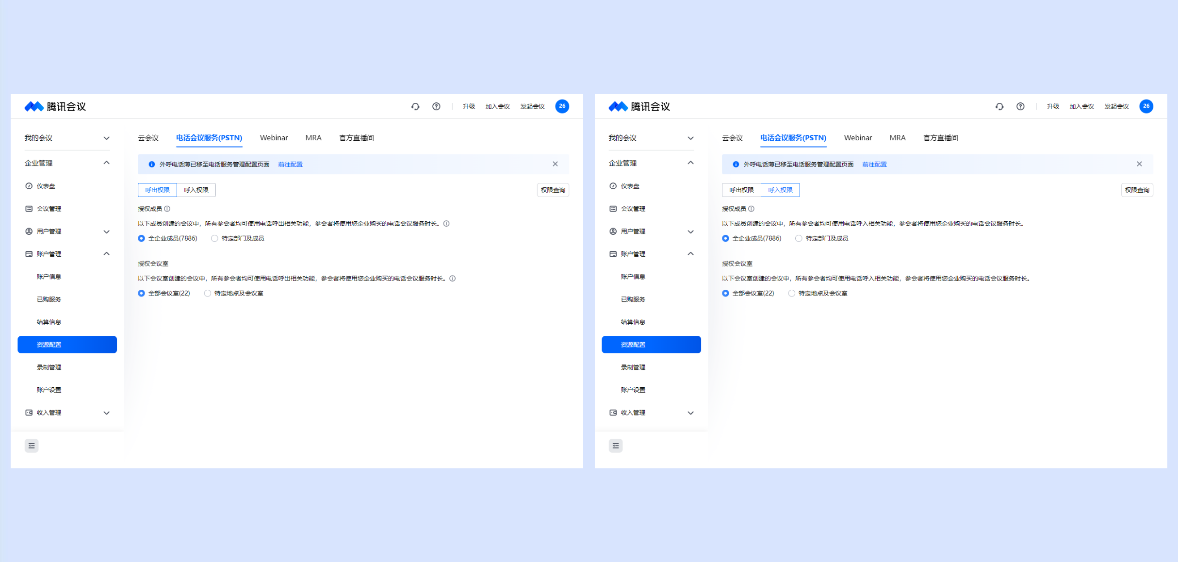②可以在企业管理后台->账户管理->资源配置->电话会议服务中配置电话会议服务呼入和呼出权限。