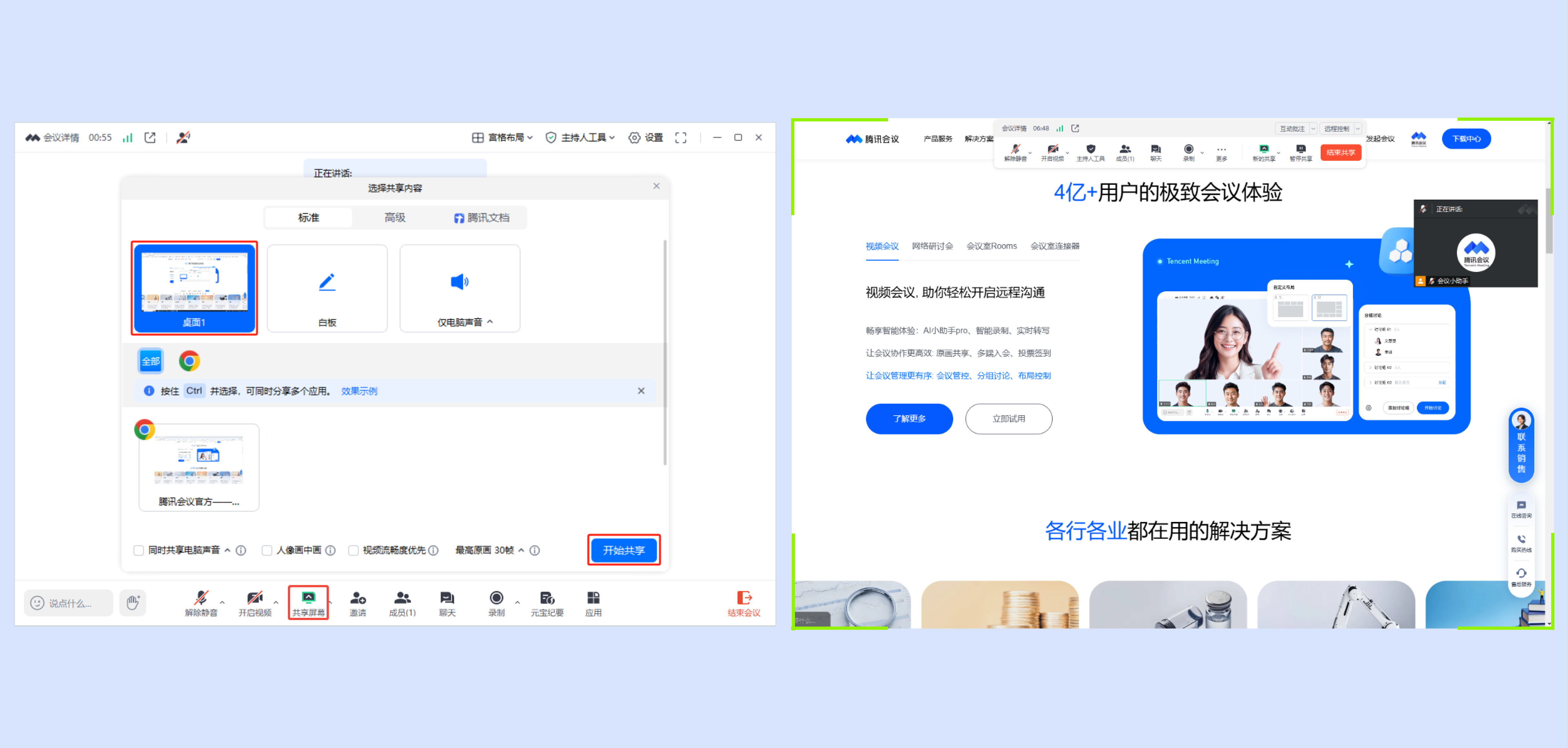 ①会中点击底部工具栏【共享屏幕】->选择共享内容,并点击【开始共享】,即可开启屏幕共享。